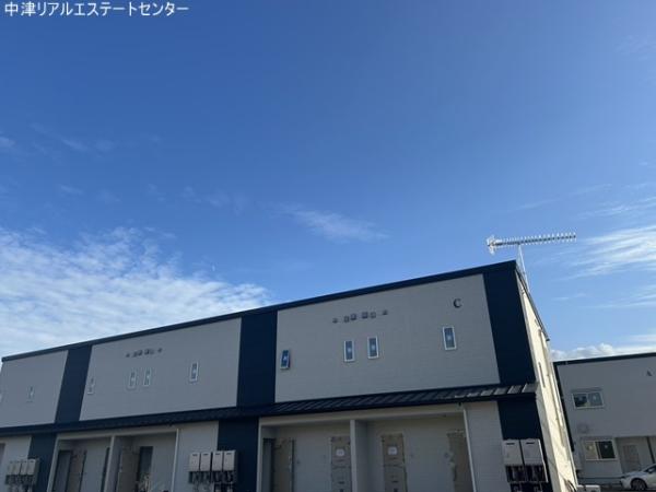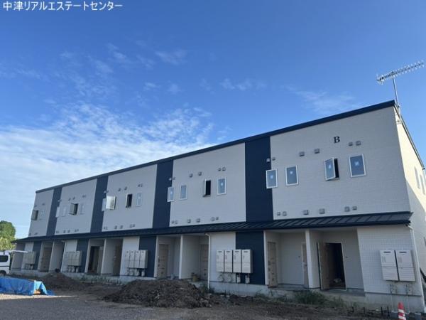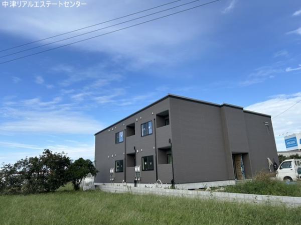 中津市大新田に建築中の木造オートロック1LDK